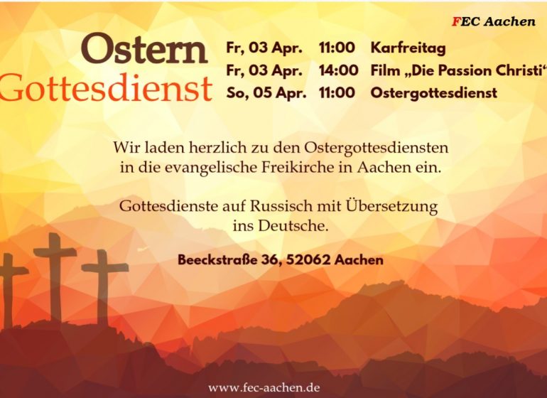 Fr, 03 Apr.11:00KarfreitagFr, 03 Apr.14:00Film „Die Passion Christi“So, 05 Apr.11:00Ostergottesdienst Wir laden herzlich zu den Ostergottesdienstenin die evangelische Freikirche in Aachen ein. Gottesdienste auf Russisch mit Übersetzung ins Deutsche.
